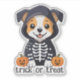 Este es un lindo pegatina de Halloween que presenta un lindo perro mascota con disfraz de Halloween que parece esqueleto. Se puede personalizar el texto predeterminado "trşck or trate".