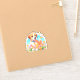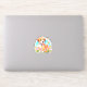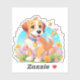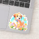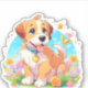 Un pegatina con una foto de un cachorro adorable sentado entre las flores. Se ve muy feliz de estar rodeado de flores y mariposas. El regalo perfecto para dar a los que aman los perros perritos. Contiene contenido generativo.