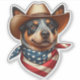 Un Heeler Azul retratado como un vaquero con un gorra de cuero emparejado elegantemente con una bandana de la bandera estadounidense, encarnando el orgullo americano y el encanto temático.