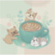 Un bonito ilustracion de tres bulldoges franceses y una taza de café