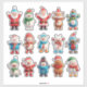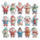 Figuritas festivas y coloridas de vacaciones que representan a Santa, muñecos de nieve alegres, renos y pingüinos vestidos con ropa temática festiva, simbolizando el espíritu, la alegría y la celebración de la Navidad y el invierno.