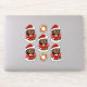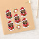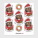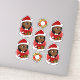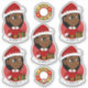 Conjunto de siete pegatinas cortados de vinilo con el ilustracion de un lindo chica afroamericano sonriente y feliz de cabello largo y negro, que está vestido con ropa de Navidad y lleva un gorra rojo de Santa Claus, de fondo rojo; cinco pegatinas del chica y dos pegatinas con una guirnalda de Navidades; con una plantilla de texto de personalizable para tu nombre o mensaje