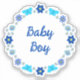 Esta asombrosa hoja de pegatina con forma de muestra una imagen de arte digital de un grupo de flores y mariposas, cada una con un tono azul para representar a un bebé. Las flores incluyen Dahlias, lirios de agua, no me olviden ni crisantemos. Las flores y las mariposas están dispuestas en círculo y hay un texto personalizado en el círculo para que puedas personalizarlo como quieras, haciendo este diseño perfecto para revelar el género del bebé, para una ducha bebé o para celebrar a un bebé recién nacido.