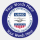 Este pegatina personalizado está decorado con el escudo USAID de la Agencia de los Estados Unidos para el Desarrollo Internacional (USAID) que se puede personalizar con una selección de palabras arriba y abajo que le permiten personalizarlo con el nombre de una persona, lugar, posición, etc.