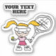 pegatina de calcomanías personalizados con un lindo personalizado de tenis. Personaliza tus pertenencias. Chica de tenis con raqueta grande y pelota de tenis. De vuelta a los suministros escolares para los niños.
