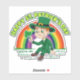 Un vinilo con el Ilustracion de un lindo leprechaun sonriente vestido con un traje verde, un sombrero top mientras sostiene una hoja de shamrock, con un arco iris colorido en el fondo y un texto que dice "Feliz Día de San Patricio" Un diseño perfecto para celebrar el Día de San Patricio, dibujado por Radka2D