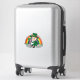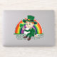 Pegatina de vinilo con el Ilustracion de un lindo leprechaun sonriente vestido con un traje verde, un sombrero top mientras sostiene una hoja de shamrock, con un arco iris colorido como fondo Un diseño perfecto para celebrar el Día de San Patricio, dibujado por Radka2D