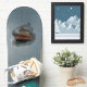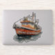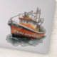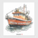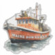 Uno de los barcos de langosta de Maine planeando en las aguas del océano con colores rojo y negro. Texto de "Downeast principal" a un lado de la banda.