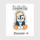 A cute funny hand drawn cartoon penguin with snowballs and snowflakes background. Personalized name stickers.