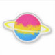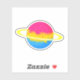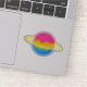 Arte digital de un planeta brillante en los colores de la bandera pansexual rodeada por anillos como Saturno en el espacio exterior.