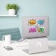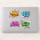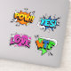 Una colección de cuatro burbujas de diálogo y explosiones de acción vibrantes al estilo de los cómics. El conjunto incluye "POW!!", "¡SÍ!", "AMOR" y "¿QUÉ?" en letras mayúsculas 3D en negrita con patrones de semitonos, puntos de Ben-Day y marcos "explosivos" dentados.