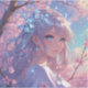 Un retrato de anime de una joven con el pelo largo y fluido de plata y ojos azules brillantes. Está adornada con un cabecero elaborado y aretes de grandes diamantes azules. Sus delicadas características están enmarcadas por un vibrante telón de fondo de flores de cerezo rosa, con un suave y brillante cielo detrás de ella. Lleva una prenda blanca adornada con pequeñas joyas brillantes y una sonrisa sutil adorna sus labios. El estilo general es llamativo y etéreo, lo que hace pensar en una princesa o una figura diosa en un entorno de fantasía.