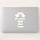 Decal de vinilo con el texto "Proteger a los niños, no a las armas" en un estilo de escritura a mano verde menta y gráfico de arcoiris pastel sobre fondo morado.