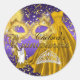 Pegatina de Quinceañera de oro y púrpura. Cumpleaños 15. Máscara de diamante brillante de bonito y tiara con vestido de oro y tacones de purpurina. Por favor, tenga en cuenta: ¡Todas las imágenes planas!