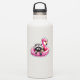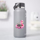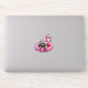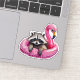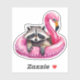 Este pegatina presenta un retrato acuático de un mapache sentado en un flotante de flamingo rosa.