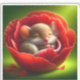 Un ratón tierno y esponjoso durmiendo pacíficamente dentro de una vibrante flor de amapola roja. Los pétalos de la flor son suaves y detallados, rodeando el ratón como una cama acogedora. El entorno está decorado con suaves tonos verdes que crean un ambiente sereno y tranquilo, con un toque de luz brillante que le da un toque mágico.