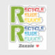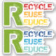 Reciclar, reutilizar, reducir comillas con Pegatina de texto colorido. Este colorido diseño ecológico presenta un conjunto con dos piezas de la cita "Reciclar, reutilizar, reducir" en un tipo de letra de color gris. La primera es de color verde, rojo, naranja y amarillo, la segunda de color verde y azul en diferentes tonos.