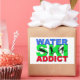 ¡Para el adicto al esquí acuático! Silhouettes negras de slalom, engañar y saltar a los esquiadores de agua con el texto "adicto al esquí acuático" en letras azules, verdes y rojas.