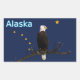 Un águila calva dispara el cielo desde su posición sobre una rama de árbol; superpuesto sobre una bandera de Alaska. El texto que dice "Alaska" también aparece en azul brillante y blanco.