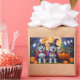 Escena divertida de Halloween con un pequeño y travieso cachorro mirando desde una calabaza tallada, rodeada de vibraciones de otoño espeluznantes y divertidas. Con un encanto descarado y colores otoñales, es el toque de humor perfecto para la temporada.