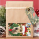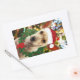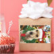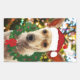 Un cuadro de arte digital de un joven cachorro listo para Navidades con una corona, sombrero de Santa y un árbol decorado.