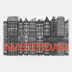 Leuke sticker met de tekst Amsterdam in rood met traditionele Amsterdamse grachtenpandjes op de achtergrond.