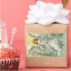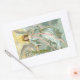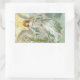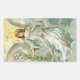 arte vintage con la pintura de un ángel vestido de azul claro flotando en el cielo entre las nubes y sosteniendo flores.