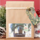 Foto de una ardilla gorda sentada en una canasta en la nieve que cae diciendo "Feliz Navidad" en un globo de voz. La nieve se está acumulando en esta foto de invierno con un fondo blanco de nieve caída y ramas verdes de árboles verdes. "Feliz Navidad" está escrito en rojo y rojo. Esta foto de una ardilla en invierno se puede personalizar e imprimir en diferentes productos fotográficos.