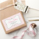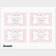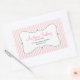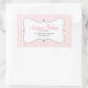 Este pegatina de panadería cuenta con un fondo rayado vertical rosa y blanco y un marco blanco giratorio que ofrece texto de personalizable para un nombre de negocio, dirección e información de contacto.