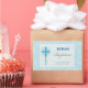 Regalo de bautismo perfecto, recuerdo, obsequio o fiestas esenciales para felicitar a un niño pequeño como bautizado. La mirada de encaje en el frente está sobre azul claro y le envía bendiciones. Una cruz muestra la naturaleza cristiana o católica del evento religioso especial.