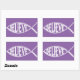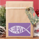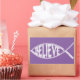Símbolo cristiano de pescado con la palabra "BELIEVE" en texto blanco sobre fondo de lavanda.