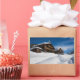 Pegatina fotográfico rectangular con un par de tradicionales cabañas de madera o chalés cubiertos de nieve bajo un cielo azul en una estación de esquí en los Alpes de Austria en invierno.