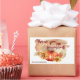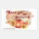 Calabazas acuarelas, girasoles y hojas de otoño sobre un fondo dorado rosa con chispas. Pegatinas para pequeñas empresas.
