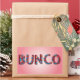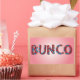 Este diseño inspirado en el Bunco presenta letras que tienen dados rojos de bunco. Los colores de fondo se pueden cambiar. Uso para invitaciones, premios y regalos.