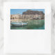Pegatina fotográfico rectangular con dos botes en el pequeño puerto viejo de Cefalu, un pueblo antiguo con casas torcidas frente al mar y una pequeña playa de ciudad en la costa norte de Sicilia, isla en Italia.