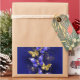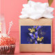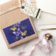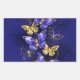 Composición de lujosas mariposas de zafiro y joyas de oro sobre fondo de textura azul.