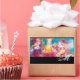Colorida, artística, caprichosa, abstracta pintura acuática contemporánea figurativa con tres figuras de jugador, giratorias florales, rosas, flores, chispas doradas, Relieve metalizado plateado en colores vivos amarillo, verde rojo, azul, fucsia rosa.