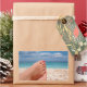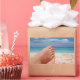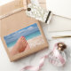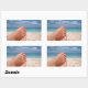 Pegatina fotográfico rectangular con los pies de las mujeres con esmalte de uñas rojo rosado en una playa blanca de una isla en el mar Mediterráneo, relajándose durante las vacaciones de verano.