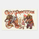Circo victoriano - Elefantes y Payasos. Imagen antigua de un circo - Ir al circo solía ser la gran noche fuera en los viejos tiempos. El circo fue divertido para la familia. Esta imagen de circo es una imagen vintage de una procesión de circo de antaño, cuando los artistas caminaban alrededor del anillo circense y saludaban a la audiencia. La procesión del circo comienza con un elefante que monta una bicicleta y se viste como un niño. ¡Bastante hazaña! Luego vienen los payasos y hombres con grandes gorras y banderas de antaño. Traer la parte trasera de la procesión de circo es otro gran elefante, caminando sobre dos piernas sosteniendo su ventilador japonés, un gorra, un bastón y vestido como un caballero victoriano adecuado. El ilustracion está a todo color, con un encabezamiento de gran lectura que dice: La procesión del circo. El rojo, el azul, el naranja y el amarillo son los colores predominantes del ilustracion. Sobre la procesión del circo Una procesión de circo serpentea a través de la calle principal de los pueblos, antes de que se instale la gran cima que reúna a multitudes de asistentes al circo. El ilustracion, La procesión del circo, fue la portada de un libro infantil antiguo impreso en 1888 por McLoughlin Brothers of New York.