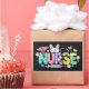 Letras coloridas con un sombrero de enfermera, estetoscopio, flores y símbolos médicos divertidos. Un gráfico alegre que celebra a las enfermeras atentas y los profesionales de la salud durante la temporada de Pascua con una atmósfera hospitalaria brillante y amigable.