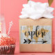 Un diseño lindo con una frase de texto de gol den y un mapa dorado del mundo sobre un fondo de tabla gris. Artista: Studio W