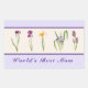 ¿A tu madre le encantan los iris? Vienen en muchos colores y especies hermosos, como siberiano, barbudo y más. Así como los daffodils están decayendo, los iris empujan hacia arriba con sus formas fascinantes, con las formas distintivas de sus gloriosas banderas. Este diseño presenta ilustraciones vintage de iris morados y amarillos de diversas variedades, rodeados por un borde violeta. El texto "La mejor mamá del mundo" está debajo.