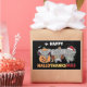 Feliz Hallothanksmas - feliz Halloween, Día de Acción de Gracias y Navidades. El elefante está vestido de murciélago en Halloween. Con una tarta para el día de Acción de Gracias, decorada con la gorra de Santa en los Navidades.