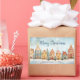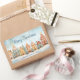 Una fila de bonitos de casas de pan de jengibre muestran dulzmente a través de esta pegatina de Navidad. Esta alegre acuarela es de origen vintage. La escena del invierno nevado incluye "Feliz Navidad" en contraste con el guión azul oscuro que puedes editar si quieres. Asegúrese de editar los nombres "de" y también la fecha.