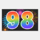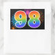 Este divertido y vibrante diseño de pegatinas presenta un colorido patrón inspirado en fuegos artificiales de celebración, junto con el número "98" con un patrón de gradiente inspirado en un arcoíris multicolor, sobre un fondo de color negro. Las pegatinas como esta podrían usarse en una fiesta para celebrar el cumpleaños número noventa y ocho de alguien, o quizás para el aniversario de bodas número noventa y ocho de una pareja, o algún otro evento número 98. [~Z0000324]