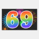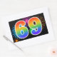 Este divertido y vibrante diseño de pegatinas presenta un colorido patrón inspirado en fuegos artificiales de celebración, junto con el número "69" con un patrón de gradiente inspirado en un arcoíris multicolor, sobre un fondo de color negro. Las pegatinas como esta podrían ser utilizadas en una fiesta que celebre el sexagésimo noveno cumpleaños de alguien, o quizás para el sexagésimo noveno aniversario de bodas de una pareja, o algún otro evento 69. [~Z0000324]