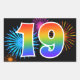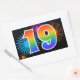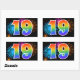 Este divertido y vibrante diseño de pegatinas presenta un patrón colorido inspirado en fuegos artificiales de celebración, junto con el número "19" que tiene un patrón de gradiente multicolor como un arcoíris, sobre un fondo de color negro. Las pegatinas como esta podrían ser dadas como un pequeño regalo mientras se celebra el cumpleaños número diecinueve de alguien, o quizás para el aniversario de bodas número diecinueve de una pareja, o algún otro evento número 19. [~Z0000324]