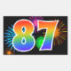 Este divertido y vibrante diseño de pegatinas presenta un patrón colorido inspirado en fuegos artificiales de celebración, junto con el número "87" que presenta un patrón de gradiente como un arcoíris multicolor, sobre un fondo de color negro. Las pegatinas como esta podrían ser entregadas como un pequeño regalo mientras se celebra el ochenta y siete cumpleaños de alguien, o quizás para el aniversario de bodas número ochenta y siete de una pareja, o algún otro evento 87. [~Z0000324]