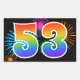 Este divertido y vibrante diseño de pegatina presenta un patrón colorido inspirado en fuegos artificiales de celebración, junto con el número "53" que tiene un patrón de gradiente multicolor como un arcoíris, sobre un fondo de color negro. Las pegatinas como esta podrían ser utilizadas en una fiesta para celebrar el cumpleaños número cincuenta y tres de alguien, o quizás para el aniversario número cincuenta y tres de bodas de una pareja, o algún otro evento número 53. [~Z0000324]