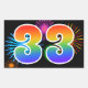Este divertido y vibrante diseño de pegatina presenta un patrón colorido inspirado en fuegos artificiales de celebración, junto con el número "33" que tiene un patrón de gradiente multicolor como un arcoíris, sobre un fondo de color negro. Pegatinas como esta podrían ser dadas como un pequeño regalo mientras se celebra el cumpleaños número treinta y tres de alguien, o quizás para el aniversario de bodas número treinta y tres de una pareja, o algún otro evento número 33. [~Z0000324]
